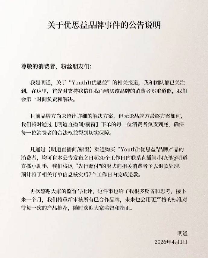 接不到什么片约的明道,基本就是靠直播带货维生,他也承诺,尽管品牌方尚未给出详细解决方案,但他都会对下单的每一位消费者负责到底,他的解决方案也是先行赔付,7个工作日内完成退款。只不过明道的方案没有明确是否未拆封才能赔付,但也算很有诚意了。