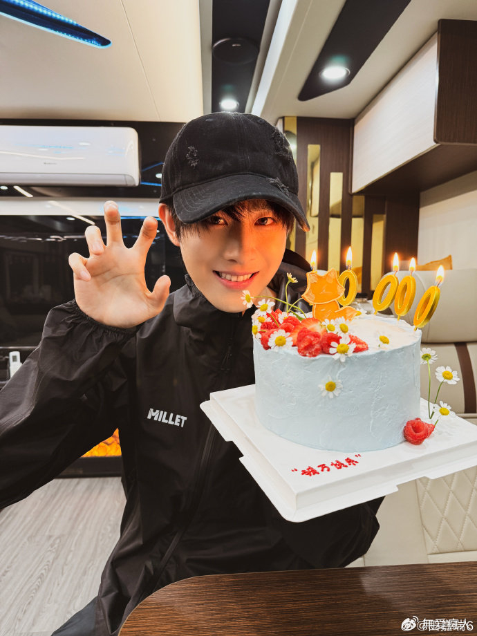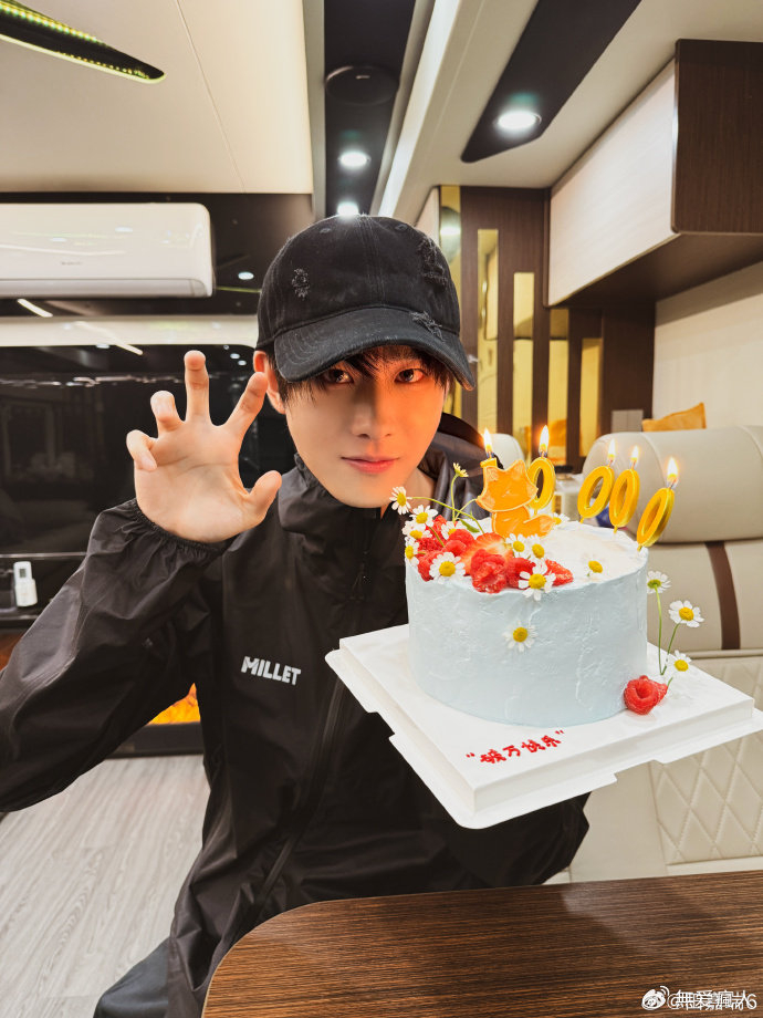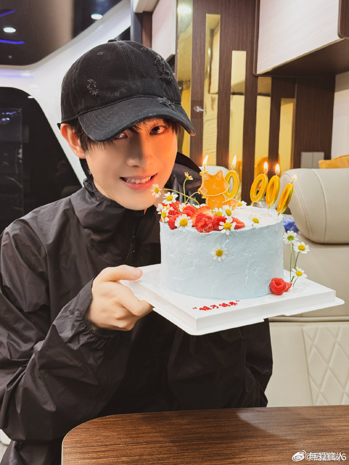 画面里,田嘉瑞头戴黑色棒球帽,身着简约黑色外套,坐在室内环境中,手中稳稳地托着生日蛋糕。那蛋糕宛如一件精致的艺术品,淡蓝色的奶油似澄澈的天空,上面点缀着洁白的小雏菊、鲜红的草莓和金黄的数字蜡烛,还有一只可爱的小狐狸装饰,处处透着清新与美好。“破万快乐”的字样,更增添了一份特别的喜悦氛围。