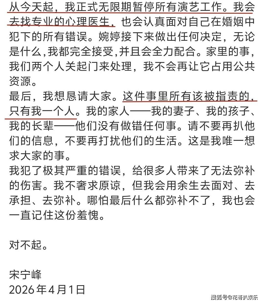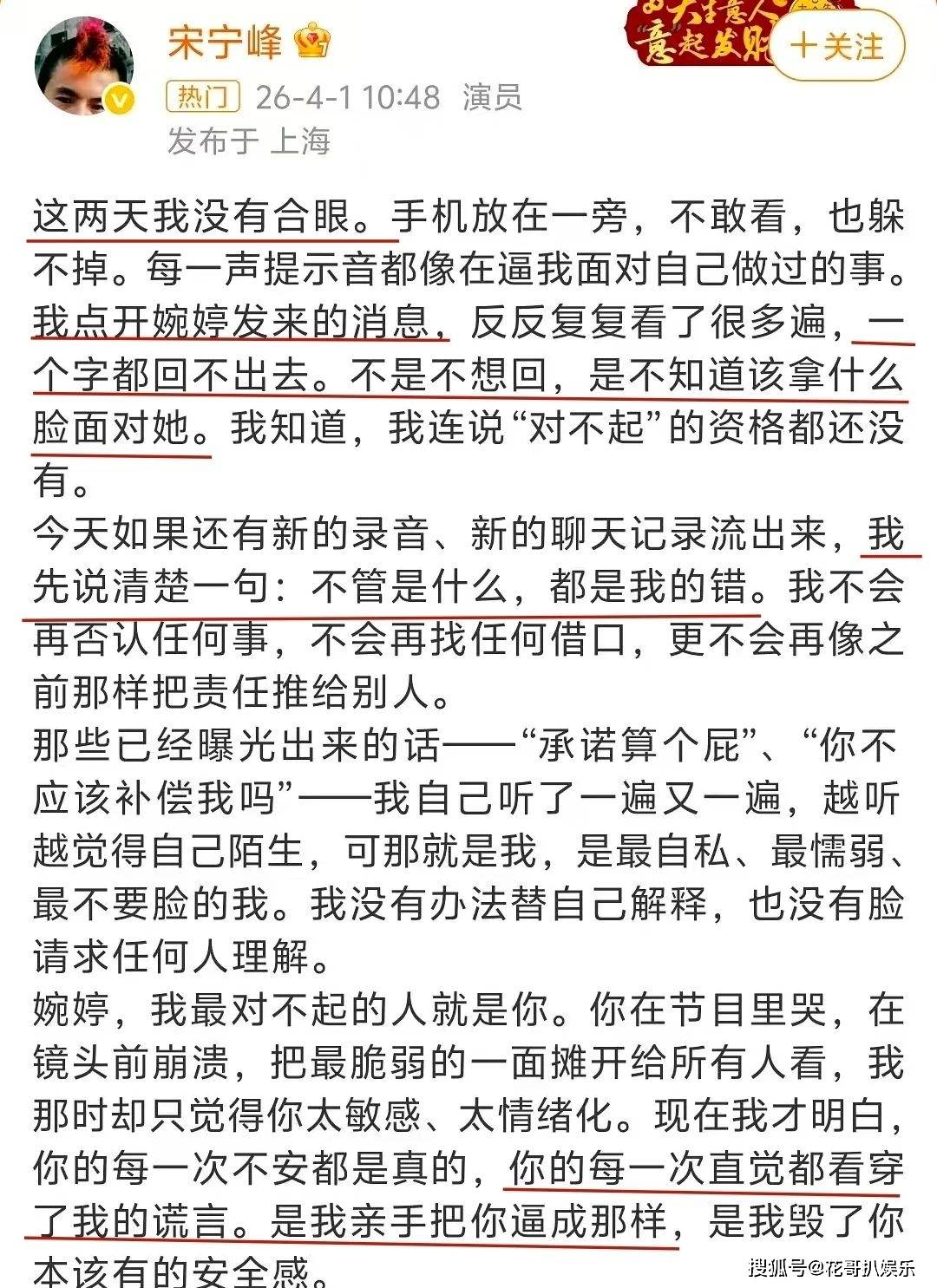随着舆论持续发酵,事情闹得全网皆知,宋宁峰选在愚人节当天,发布了一篇长文回应此事。开篇他便开始卖惨,称自己连续两天未曾合眼,无颜面对妻子张婉婷。