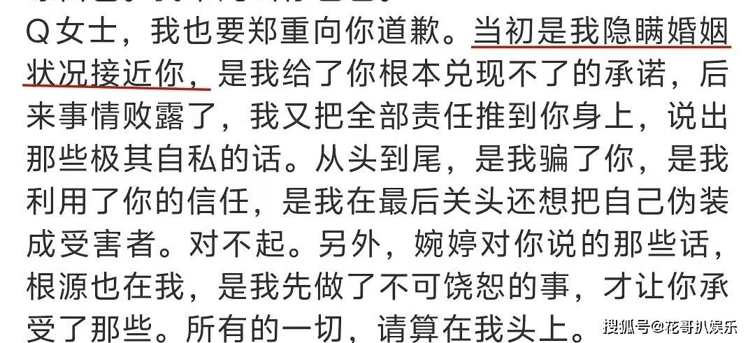 虽然自己很对不起张婉婷和Q女士,但他大方原谅了张婉婷。还假惺惺说什么我只希望你能够照顾好自己。