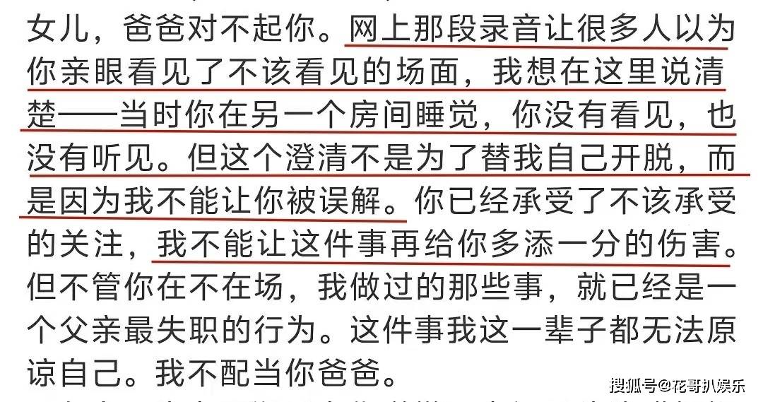 他一边说着自己犯下了不可饶恕的错误,一边又悄悄为自己开脱,提到带女儿与小三见面一事,特意强调孩子在另一个房间休息,没有受到影响,试图用孩子来博取同情,却全然不知,他的这种行为,早已给年幼的孩子留下了难以磨灭的童年创伤,带给孩子最大伤害的,从来都是他这个不负责任的父亲。