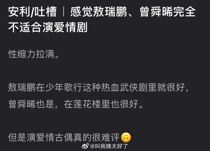 有网友说感觉敖瑞鹏、曾舜晞完全不适合演爱情剧,两人性缩力拉满,大家怎么看?