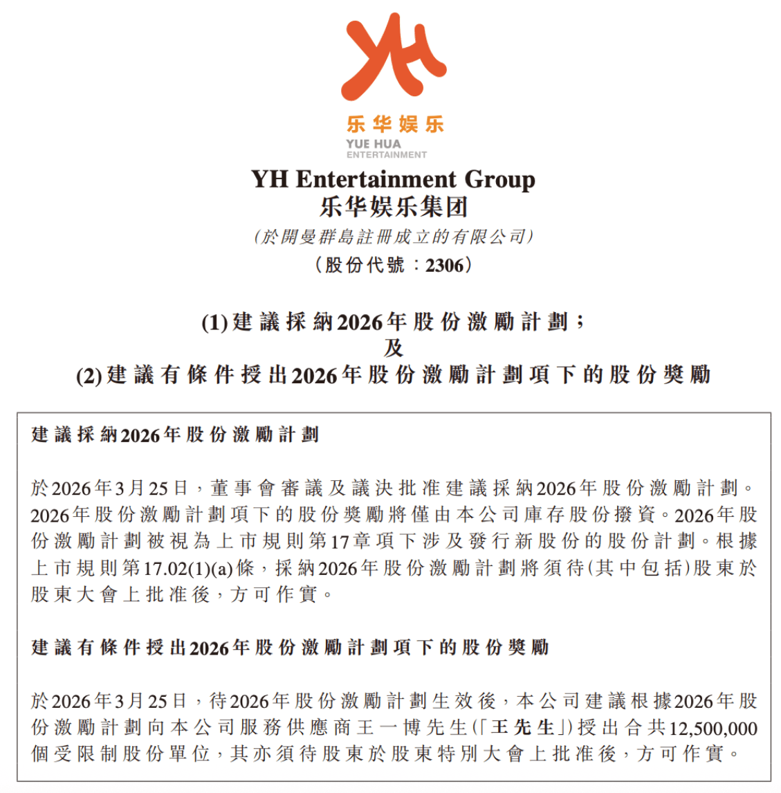 乐华娱乐公告显示,待2026年股份激励计划生效后,公司建议根据2026年股份激励计划向公司服务供应商王一博授出合共12500000个受限股份单位,向王一博授出占公司已发行股份总数的约1.51%。鉴于该授出超过2026年股份激励计划所载的个人限额,该授出须经股东于公司股东大会上批准。