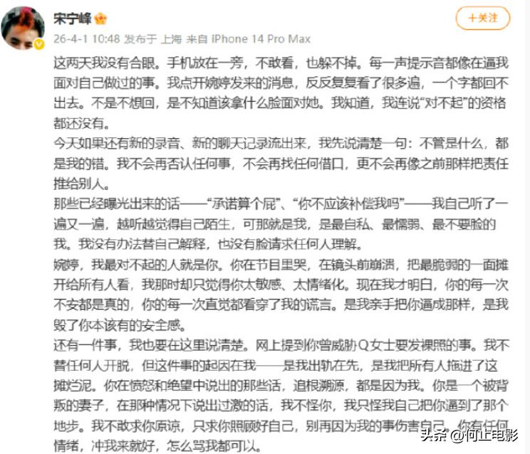 宋宁峰在他自己发的微博中坦率承认,自己隐瞒已婚事实,出轨Q女士。