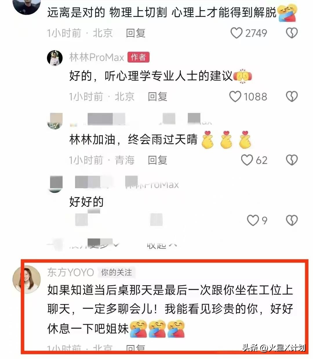 在四位老同事接连发布离职帖后,她没有冷眼旁观,而是挨个在他们账号的评论区里留言送上了祝福。