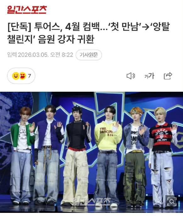 **TWS:音源强者再现,舞台制霸开启** ,韩国男团TWS的名字越来越多出现在娱乐圈的热门话题中,而这一次,他们的回归绝对让粉丝们热血沸腾!不仅是新专辑的预热,还有Weverse Con Festival的加盟,这两大事让TWS的未来充满了无限可能。,TWS的新专辑回归被直接称为“音源强者”的重返战役,官方已经确认将于2026年4月发行全新专辑,这是距离上一张迷你四辑《play hard》只隔了6个月,这种高效的创作节奏,既让人惊叹,也让人期待他们能否延续“音源强者”的神话,前几张作品已经让他们占据了“音源天花板”的地位,OVERDRIVE》逆袭全民红歌榜,甚至创造了三首歌同时打入主流音源榜的纪录,新专辑继续延续他们的“少年感流行”基因,清爽的能量和自由的风格,让人忍不住想着“打卡”一波。,TWS的实力不仅仅在音源上,他们的舞台表现更是无可撼动,今年3月底,他们被确认将加盟2026 Weverse Con Festival,这是他们继2024、2025后第三次参与这个国际性的音乐节,作为开场嘉宾,他们之前的表现已经让人印象深刻,2025年演出时的《꺼내 먹어요》和《내 입술 따뜻한 커피처럼》都让人感受到他们在抒情和活力上的双面魅力,今年的演出更是有新歌首演的契机,5月末至6月初的音乐节恰好落在新专辑宣传期,这无疑是全球粉丝期待的舞台时刻。,除了音源和舞台的双重优势,TWS还在全球化战略上下功夫,他们已经通过签约环球音乐旗下的厂牌,覆盖了美日市场,而Weverse Con Festival的多语种直播则让全球粉丝都能参与其中,这种“24/7 WITH US”的陪伴理念,让他们的粉丝基础越来越庞大,更重要的是,他们的双线企划不仅是为了巩固国内市场的地位,更是为了在国际化的音乐市场中占据一席之地。,TWS的2026年充满了挑战和机遇,无论是新专辑的回归,还是Weverse Con Festival的舞台表现,这些都让他们成为“音源强者”和“舞台制霸”的双重身份的完美诠释,他们的青春能量和突破自我的精神,正以这样的节奏,继续在音乐版图上绘制属于自己的精彩篇章!