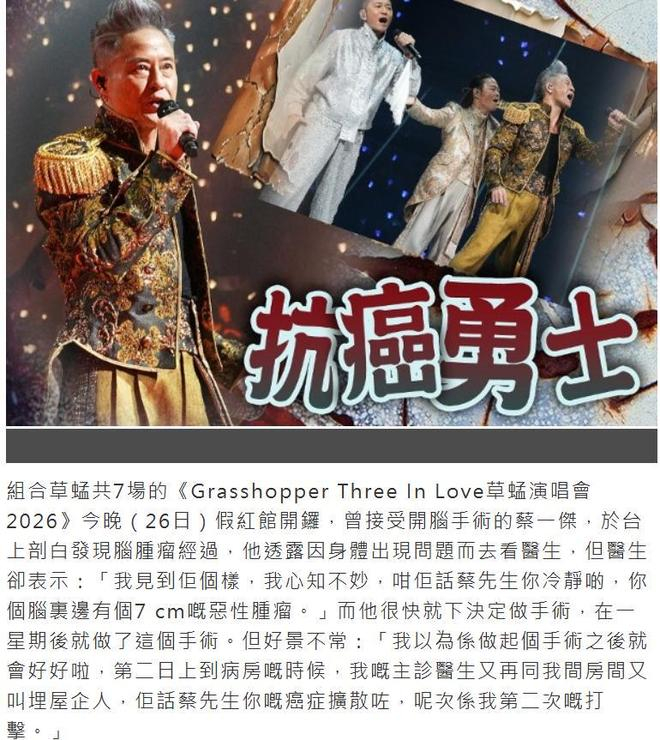 **草蜢40周年演唱会:蔡一杰逆袭脑癌,演出状态全在线,彻底展现了“全员加速”的逆袭精神!** ,天啊!草蜢40周年演唱会,在红磡体育馆拉开帷幕,当晚现场座无虚席,三位老爷们凭借经典舞台和高水准的演唱,彻底带回了八十、九十年代的黄金记忆!不过这次演唱会可不仅仅是一个简单的40周年庆,藏在这场盛会背后的是一段惊人的健康隐患——主唱蔡一杰! ,作为草蜢的核心,现年五十九岁的蔡一杰在这场演唱会上彻底震撼了所有人!不仅他在舞台上的状态活力满满,完全看不出几年来的手术创伤,甚至在和陈奕迅、草蜢成员互动时,状态轻松自如,完全不像刚经过开颅手术的病人! ,真正让人心疼的是,蔡一杰的病情比我们想象的要严重得多!两年前的检查报告显示,他颅内有七厘米的恶性肿瘤,经过手术后,体重从72公斤骤降到63公斤,头顶还留下了一道U型的疤痕,更令人心痛的是,在术后的第二天,医生就告诉家属,癌细胞已经开始扩散,这意味着他的治疗路还很漫长! ,正是因为如此,蔡一杰才更是展现了“全员加速”的逆袭精神!他在手术后一个月便开始恢复身体机能,同年十二月就回归录音室参与工作,这样的恢复速度,医生都觉得难以置信!更令人钦佩的是,他为了不给家人和歌迷带来负担,始终对自己的病情严格保密,只在必要时刻简单提及手术情况,隐瞒了恶性肿瘤和癌细胞扩散的关键信息。 ,这次四十周年演唱会,是蔡一杰患病后首次在如此重要的场合,公开讲述自己的抗癌经历,他在舞台上坦言,自己从未想过能够以健康的状态站上舞台,言语间满是感慨与庆幸!更是在分享抗癌心路历程时,他没有过多渲染痛苦与无助,而是以积极的心态面对一切,分享了自己对生活的珍惜与热爱。 ,演唱会上,草蜢三位成员还展开了不少温情互动,蔡一智提到恩师梅艳芳的重要帮助,现场演绎《爱将》致敬恩师,场面感人至深,而蔡一杰在与陈奕迅和草蜢成员的互动中,状态完全在线,活力十足,仿佛什么都没发生过! ,更有趣的是,陈奕迅作为本场的特邀嘉宾,现场分享了他与草蜢成员的许多有趣故事,整个现场氛围十分融洽,草蜢的舞台把控力依旧如一,三位老爷子凭借经典歌曲和默契配合,带观众回到了音乐的黄金时代。 ,尽管如此,蔡一杰的每一次舞台表演背后,都承载着巨大的努力,他每天都要进行高强度的体能训练,才能维持舞台状态,同时还要按时接受治疗和定期复查,医生表示,虽然病情目前控制得相对稳定,但脑癌的扩散带来的潜在风险仍不可忽视。 ,蔡一杰始终没有放弃,他用自己的方式对抗命运的考验,用舞台和歌曲传递着力量与希望!这场演唱会不仅是对草蜢四十周年的致敬,更是蔡一杰与病魔的较量,是一个关于坚韧与永不言弃的故事! ,草蜢40周年演唱会仍在继续,后续还有六场演出等待完成,蔡一杰依旧选择如期登台,他的这份坚持与勇气,不仅打动了现场的每一位歌迷,也让更多人看到了面对重病时的坚韧与豁达! ,**草蜢40周年演唱会不仅是一场音乐盛会,更是一场关于希望与坚韧的传奇,蔡一杰用自己的方式证明,人生短暂,但只要有希望,就没有不可能的事情!**草蜢40周年演唱会场面如期盛大,红磡体育馆座无虚席,三大主唱蔡一智、蔡一杰、苏志威当众携手登台,演唱会如同一场跨越时空的黄金盛宴,这场演唱会远不止是简单的音乐演出,更是一场震撼人心的生命力量展示。,作为草蜢的核心主唱,现年五十九岁的蔡一杰在这场演唱会上犹如一颗黑暗中的明星,他不仅首次在如此重要的场合公开自己的重病经历,更用自己的舞台表现,诠释了什么是“永不言弃”,蔡一杰的抗癌之路堪称传奇,他在去年底接受脑部肿瘤切除手术后,仅一个月的休养就重新回归录音室,去年七月还曾在陈慧琳的演唱会上现场献声,活力十足,完全看不出是一个刚经历开颅手术的患者。,这位五十多岁的老歌手,用自己的身体语言向世人证明:生命的韧性不在于年龄,而在于心态,他的坚韧不仅感动了现场的数万歌迷,更让无数正在经历困境的人看到了希望,演唱会上,他坦言自己从未想过能以这样的状态站在舞台上,但他选择用行动证明:即便面对命运的打击,也要以积极的态度面对,继续活着、继续努力。,草蜢四十年来的成功,不仅是三位成员多年的默契与努力,更是他们对音乐的热爱与坚持,演唱会中,草蜢成员多次展现了他们之间的深厚羁绊,尤其是苏志威对蔡一智的关爱与支持,让人动容,而蔡一智则用一句“没有梅艳芳的提携,就没有如今的草蜢”道出了这支组合的命运起点。,陈奕迅作为本场演唱会的特别嘉宾,同样用自己的方式为这场演出增色,他的轻松幽默与草蜢成员的默契互动,让整个现场氛围更加融洽,而草蜢的经典曲目《爱将》《心中的歌》等,都让人回味无穷。,蔡一杰的舞台表现虽然精彩纷呈,但最打动人心的,是他在分享抗癌经历时的真诚与坦率,他不仅没有沉溺于痛苦,而是用积极的态度面对,这种人生智慧让现场观众为之动容。,草蜢40周年演唱会,不仅是一场音乐盛宴,更是一场生命力量的展现,无论是蔡一杰的坚韧,还是草蜢成员的默契,都让人看到了艺术与生命的深刻联系,他们的故事告诉我们:无论前路多么艰难,只要心中有热爱,就永远不会被打倒。,这场演唱会的成功,不仅凝聚了四十年来的努力,更凝聚着一代人的情感与支持,草蜢的故事,终将成为华语乐坛的传奇,蔡一杰的坚韧,更将激励更多