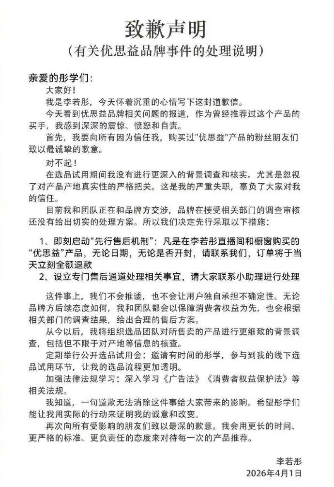 ## 优思益翻车,明星们跳舞?李若彤逆袭出头,"优思益"这个名字,最近在网上走红,不是因为产品质量过好而被吹捧,而是因为它被央视一查,揭露了它的虚伪面具,这个被称为"进口"的品牌,其实是老土的国内生产,公司海外注册地更是有一家汽车维修站,简直是典型的"假进口"大作案。,这起事件的爆发,直接把一些明星玩意儿也拖入了泥潭,赵露思、曾舜晞、伊能静、吴昕、孙坚等明星,都被曝光参与了这场"直播带货狂欢节",更令人哭笑不得的是,与其说是"明星效应",不如说是"陌生人效应",因为这些明星在带货时,消费者买单的本质目的是对"明星背书"的信任。,在这场"明星危机"中,最让人看热闹的是李若彤,这个"老好人" tm,第一时间发出了道歉声明,不仅如此,她还给出了令人感动的"先行赔付方案",无论消费者是否拆封,都能当天上门全额退款,还专门设立了售后通道,这种赔付方案,不仅体现了李若彤对消费者的责任担当,更堪称"吃瓜教主"的完美反转。,相比之下,其他明星的表现就显得微不足道了,明道虽然也承诺赔付,但具体条件还不够明确;章小蕙的赔付期限也没有完全承诺;而一些"跑光了"的明星,直接躲进了"无知情"的茧子里,这些人的选择,恰恰印证了一个道理:明星带货 ≠ 明星负责。,这起事件对明星和主播的影响可谓是三重打击:,1. **口碑受损**:一旦被曝光,"明星背书"往往比品牌更容易在消费者心目中留下烙印,哪怕法律责任还未定,也难免有人会说"你推荐过这个,为什么现在在讽刺它?",2. **商业合作风险**:从此以后,平台方和品牌方都会格外谨慎,尤其是涉及保健品、母婴、美妆和跨境商品等信任度高的领域,明星的选择,必然会被品牌方仔细考量,甚至可能连带其它合作机会。,3. **潜在法律与赔付压力**:如果监管部门认定宣传存在问题,消费者维权潮就要来了,平台方面也会被连带追责,品牌方更是要面对连锁反应,包括消费者维权、平台追责、法律诉讼等。,这次事件给"明星信用变现"模式敲响了警钟,明星们要明白,自己不是品牌的"推广机器",更不是消费者的"风险保驾员",要真正做到"查生产链路、查资质边界、查宣传话术、查功效证据、查跨境身份真假",否则只会是"赚一时,损一生"。,对消费者来说,也要"别再把明星推荐当质量保证",买保健品、母婴、美妆等产品时,优先看三件事:**谁生产**、**有没有合规资质**、**宣传是不是过度**,凡是"故事讲得太满、背景吹得太神、价格抬得太高"的产品,都要提高警惕。,这次"优思益"事件,本质上是一次对"明星信用变现"模式的集中拷问,明星们要记住,光靠"陪品牌坐稳后马"的收益,终究不如选择良性合作的商业模式,希望明星们能从这次事件中吸取教训,选择更有责任心的合作对象,避免卷入下一次"直播带货"的"翻车"事件。