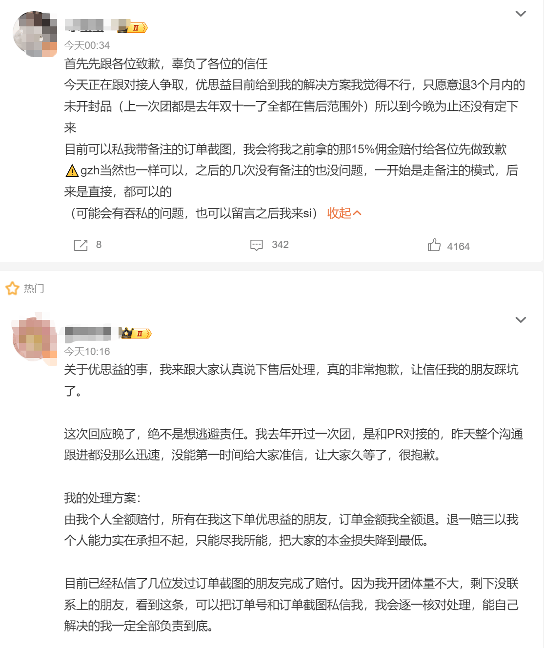 其他一些带货网红,也有不少给出解决方案,有担当的带货博主陈国全额赔付,有的咬牙退一赔三,也有担当差一点儿的,给出回应了,愿意先退自己拿到的15%佣金。