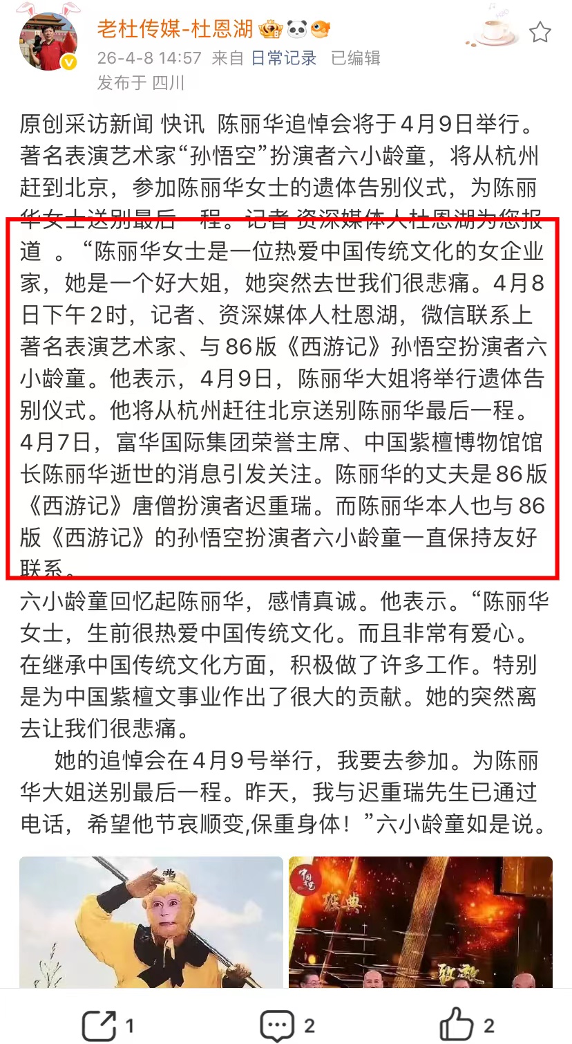 资深媒体人杜恩湖也采访六小龄童,六小龄童会从杭州赶往北京,参加陈丽华的遗体告别仪式,为陈丽华女士送别最后一程。