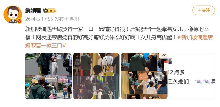 据网友4月5日爆料,一组在新加坡环球影城的偶遇照,让唐嫣和罗晋一家子成了网友热议的焦点。一家三口温馨出游的画面,被镜头捕捉下来,瞬间在网络上“刷了屏”。