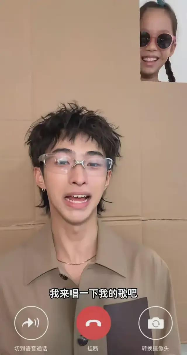 只见在恩利的视频中,兄妹俩宣传整活,拿着一个纸板子假装视频聊天。恩利戴着眼镜打扮很青春少年,穿着卡其色的睡衣正襟危坐邀请自己的妹妹米粒上线,而9岁的米粒梳着拳击辫戴着搞怪的墨镜,在镜头前表演型人格拉满,兄妹俩打歌演出小品既视感。