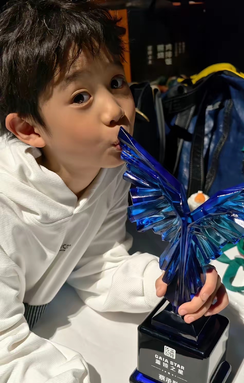 褪去T台上的成熟气场,后台的庆宝瞬间变回天真软萌的小朋友。穿着简约白色卫衣的他,手里紧紧捧着“盖娅之星”奖杯,忍不住低头亲昵亲吻,一双大眼睛亮晶晶的,满是孩童的纯真与欢喜