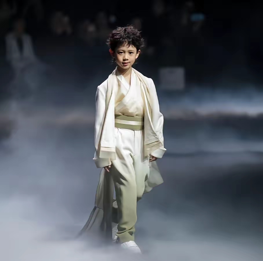 庆宝迈步走秀时,衣袂随风轻轻飘动,身姿挺拔又轻盈,宛若从画卷中走出的小仙童,将国风美学的温婉与飘逸展现得淋漓尽致。两种风格无缝切换,足以看出庆宝出色的镜头感和走秀天赋,小小年纪便拥有如此出众的台风,实在令人惊叹。