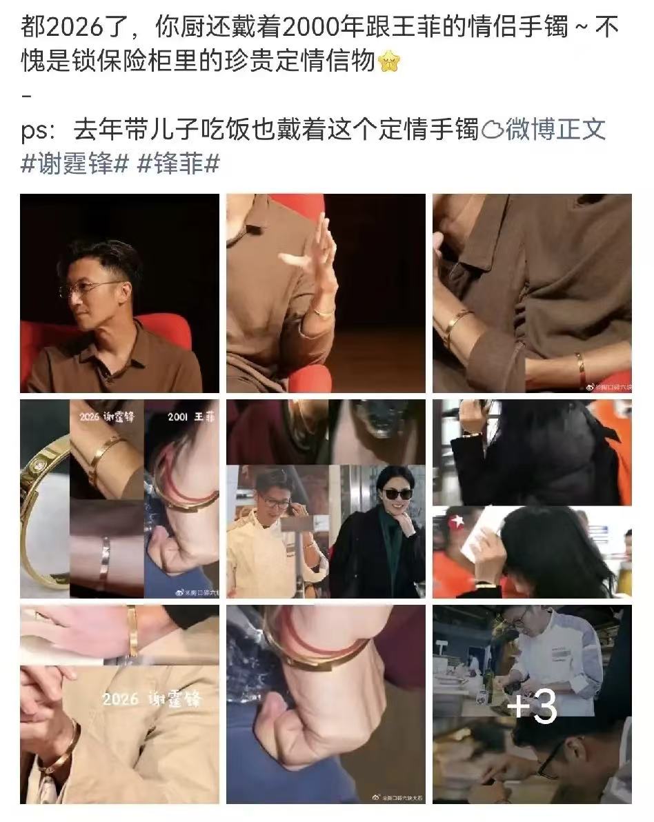前段时间因为谢霆锋回香港参加活动,手上戴的卡地亚引起了热议,热搜上了好几拨。有网友扒出说谢霆锋手上戴的卡地亚情侣手镯,是跟王菲2000年的定情物。