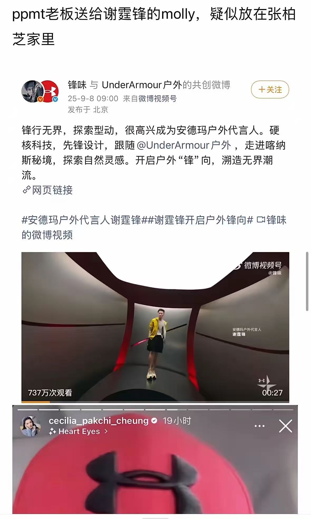 2025年谢霆锋晒出了新代言,他刚官宣没多久,张柏芝就在同一天时间晒出这个代言的logo,还写了heart eyes,直译是满眼爱意、迷恋、超级喜欢。
