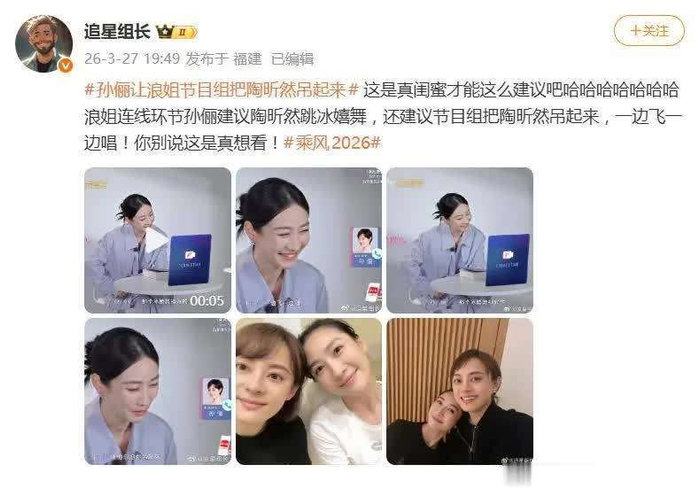 3月27日,有网友爆料称,《乘风2026》(浪姐第7季)中的亲友连线片段,引发了《甄嬛传》剧迷和综艺观众的热烈讨论。孙俪在视频中为好姐妹陶昕然打气时,话语惊艳全场,她大胆提议:把陶昕然吊起来,一边飞一边唱,甚至还想重现剧中经典的冰嬉舞桥段。网友们忍俊不禁地评论道:这才是真正的闺蜜,才敢这么‘下狠手’!