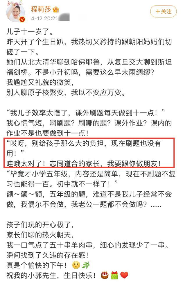 4月12日,演员程莉莎在社交平台上发文为孩子庆祝11岁生日,称自己和其他朝阳区的妈妈们聊了会儿天,发现大多数父母都是望子成龙望女成凤的。