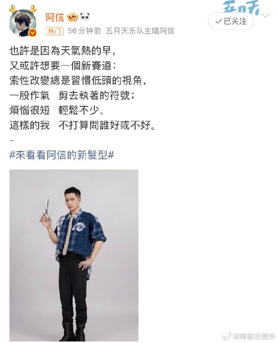 在愚人节发布的文案中,阿信将剪发动机凝练为双重隐喻:表层是"天气热得早"的生活化表达,深层则指向"想要新赛道"的蜕变决心。他特别强调此举为"改变习惯低头的视角",暗示长期被符号化形象束缚的局限。当剪刀落下时,实则是主动剥离安全区,以寸头的锐利线条挑战公众对"鬓角王子"的固化认知。