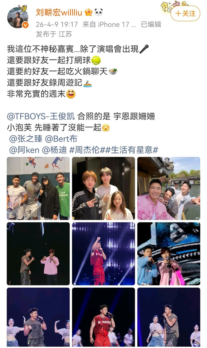 刘畊宏于2026年4月9日在社交平台发布周末聚会动态,照片记录了王俊凯与其子女刘宇恩、小泡芙的合影。主要描述此次聚会涵盖了网球运动、火锅聚餐及《周游记》节目录制,王俊凯作为受邀嘉宾参与多项活动。值得注意的是,小泡芙因提前入睡未能参与最终合影,而刘宇恩与另一女儿珊珊出现在合照中。也让大家看到了两个孩子这些年,在时光里长成了更好的模样。