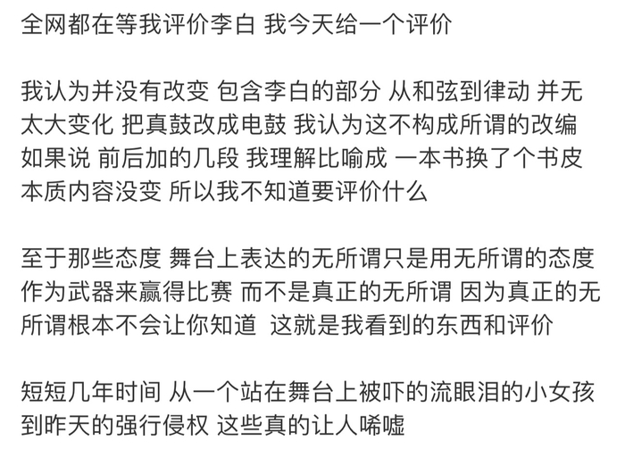 5.点评单依纯翻唱的李白不够成所谓的改编,舞台上只是用无所谓的态度赢得比赛。