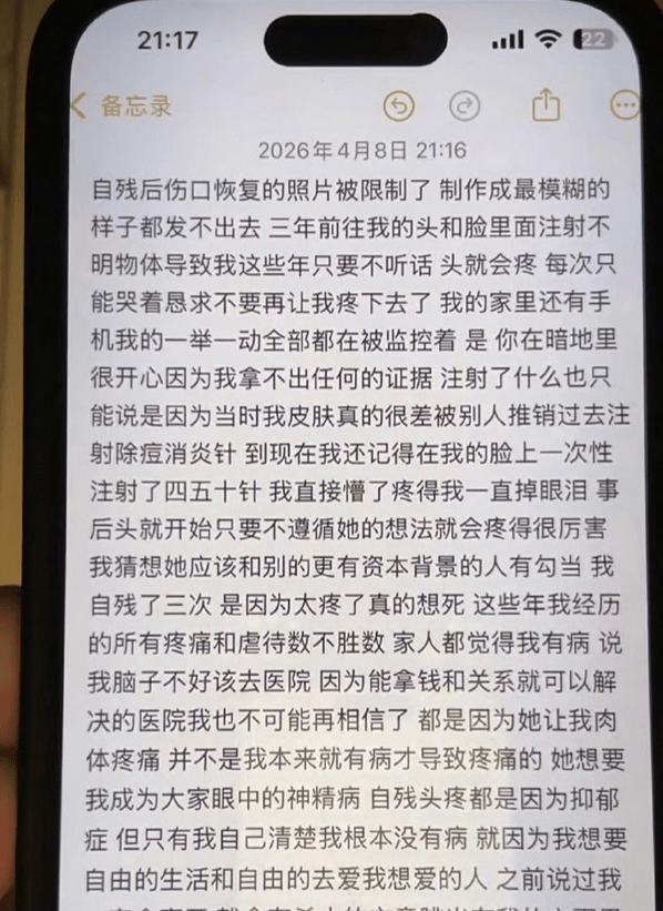 金子涵晒出手臂照片,满屏都是触目惊心的痕迹。这不是特效,不是化妆,是一个25岁女孩真实的身体。她哭着说,那些伤不是意外,是疼到活不下去时自己留下的。