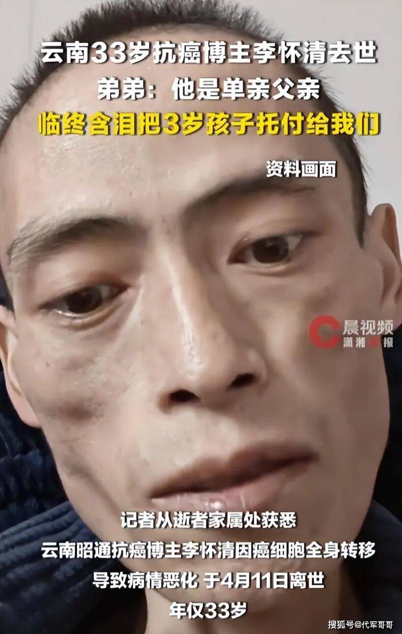 好好好好,最近又一则让人心碎的消息传遍了网友们的风光大路:云南昭通的33岁博主李怀清,于4月11日不幸永远离开了我们,这位曾经在小红书上分享生活与美食的普通博主,竟在年少的33岁时就被疾病夺走了生命,这简直就是人间的大冤枉。,说到李怀清的故事,真的让人老想给他打个大大的拥抱,33岁,本该是人生的黄金时期,正值攀登人生的峡峰、撑起家庭的年纪,但命运的齿轮却在这个本该充满希望的年纪狠狠地抽走了他的光明,原来,他的离世是由于肝癌晚期引发的全身癌细胞转移,最终在病情急剧恶化的情况下,妥协了和病魔的较量。,听说他在得知自己患上了晚期肝癌的那一刻,整个人就像被重锤击中了一样,从此,他开始了长达三年的抗癌之战,化疗、手术、靶向治疗,他尝试了所有能想到的治疗手段,每天都在药物的陪伴中挣扎,身体被一点点吞噬,四肢瘦得只剩下皮包骨,严重的肝腹水让他的肚子高高隆起,模样让人看了都心疼,更让人唏嘘的是,在抗癌的艰难征程中,他的婚姻也走到了尽头,面对沉重的治疗负担和未知的未来,妻子选择了离开,两人最终办理了离婚手续。,但即便身处绝境,李怀清依然没有放弃希望,他将自己的抗癌日常分享到社交平台,记录下与幼子的温馨瞬间,也用坚韧与乐观,给无数同病相怜的网友带去了力量,他的每一条动态,都像是给生活注入了一丝温暖,他甚至曾说,自己没什么能留给孩子的,唯一能做的,就是把社交账号留下来,等孩子长大成人,能通过里面的视频,看看父亲的模样,知道父亲曾经拼尽全力活过,也一直深深爱着他。,最动人的还是他临终前的一幕,他已经无法正常说话了,但仍然满眼是牵挂,死死盯着身边的家人,用尽最后一丝力气,紧紧拉住弟弟的手,含泪将年幼的孩子托付给弟弟、哥嫂等亲人,反复叮嘱一定要好好把孩子养大成人,那份父爱,简直让人瞬间泪崩。,最令人心疼的还是他的孩子,年仅3岁,懵懂无知,不懂什么是死亡,不懂父亲再也不会回应他的呼唤,偶尔还会伸手摸摸父亲的脸,小声喊着“爸爸起床”,稚嫩的声音,字字戳心,万幸的是,李怀清的家人们没有辜负他的嘱托,弟弟李怀松明确表示,会举全家之力把侄子抚养成人,哥嫂也主动承担起照顾孩子的责任,像对待亲生子女一样悉心照料。,33岁,本该是人生爬坡上坎、撑起家庭的年纪,本该陪着孩子慢慢长大,看着他蹒跚学步、咿呀学语,可命运的齿轮却在这个本该充满希望的年纪狠狠地抽走了他的光明,他的一生,没有惊天动地的壮举,却在苦难中坚守着父爱与坚韧;他的抗癌之路,布满荆棘与痛苦,却用乐观与温柔,照亮了自己,也温暖了他人。,李怀清的离世,不仅是一个家庭的巨大损失,更是全网的遗憾,他的故事,不仅让我们看到了普通人身处绝境时的坚强与无奈,更给所有人敲响了健康的警钟——肝癌被称为“沉默的杀手”,早期症状隐蔽,等到出现明显不适时往往已至晚期,定期体检、重视肝脏健康,才是守护生命的关键。,愿天堂没有病痛,愿李怀清一路走好,卸下所有的痛苦与牵挂,安息长眠,也愿他年幼的孩子,能在亲人的呵护与好心人的关爱下,健康快乐地长大,记得曾有一位深爱他的父亲,为了活下去、为了陪伴他,拼尽了全力,也愿每一个人都能珍惜当下,重视健康,好好守护自己和身边的人,别让遗憾,成为此生无法弥补的痛。**吃瓜简评:33岁的李怀清,在生命的巅峰跌入深渊**,一则令人心碎的消息在网络上引发热议:云南昭通的33岁博主李怀清,在4月11日的那个清晨,永远地离开了这个世界,他的离世不仅让无数网友为之动容,更让人唏嘘于生命的无常与疾病的强大。,33岁,本该是人生的黄金年龄,应该是亲子相处、家庭繁荣的年岁,而李怀清却在这个本该充满希望的年纪,迎来了生命的终结,死因是肝癌晚期引发的全身癌细胞转移,病情急剧恶化,最终无力抵挡病魔的侵袭,这个原本充满活力的生命,被无情的疾病夺走了。,抗癌的三年历程,是李怀清生命最后的遗憾,他曾经尝试过手术、化疗、靶向治疗,日复一日与药物为伴,忍受着治疗带来的痛苦与副作用,身体被一点点吞噬,四肢消瘦,腹部高高隆起的肝腹水,模样刺眼,疼痛不容忍,即便在生死边缘,李怀清依然坚持记录自己的抗癌日常,他没有刻意卖惨,也没有过度抱怨,而是用温柔的笔触,记录下与幼子的每一个温馨瞬间,也用坚韧的姿态,给无数同病相怜的人带来力量。,更令人唏嘘的是,抗癌的艰辛让他的婚姻走向终点,治疗的沉重负担和未知的未来,让妻子选择了离开,独自抚养三岁的孩子,既是父亲,也是母亲的李怀清,用自己的方式扛起了家庭的重担,即便身处绝境,他依然没有放弃希望,用自己的经历告诉每一个人:生命的坚韧,远比生命的无常更值得铭记。,李怀清的离世,不仅是一个家庭的巨大损失,更是全网的遗憾,他用自己的抗癌经历,展现了普通人面对疾病时的坚韧与勇气,他用自己的父爱,温暖了无数人的心,他用自己的抗争,给了更多人希望。,他的故事,让我们看到了生命的脆弱,也让我们深刻认识到健康的重要性,肝癌被称为“沉默的杀手”,早期症状隐蔽,等到出现明显不适时往往已至晚期,定期体检、重视肝脏健康,才是守护生命的关键。,李怀清的社交账号,依然静静地躺在那里,等待着他的孩子长大成人,等待着他们能通过里面的视频,看到父亲的模样,知道父亲曾经拼尽全力活过,也一直深深地爱着他们,这个充满父爱的男