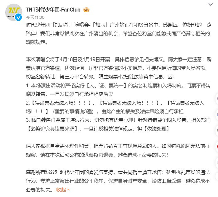 【#时代少年团回应错票无法入场#】4月14日,@TNT时代少年团-FanClub 发文:本次演唱会将于4月18日及4月19日开票,具体信息参见相关博文。请大家一定注意:购票认准官方渠道,切勿轻信一切非官方渠道的不实信息,不要相信所谓的带入场名额、粉丝名额转让、第三方平台转账、陌生购票/代拍链接等黄牛信息,因: