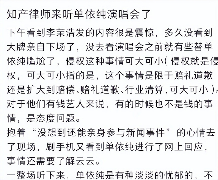 一个知识产权律师恰好去现场听了演唱会,直言自己也替单依纯感到有些心情复杂。
