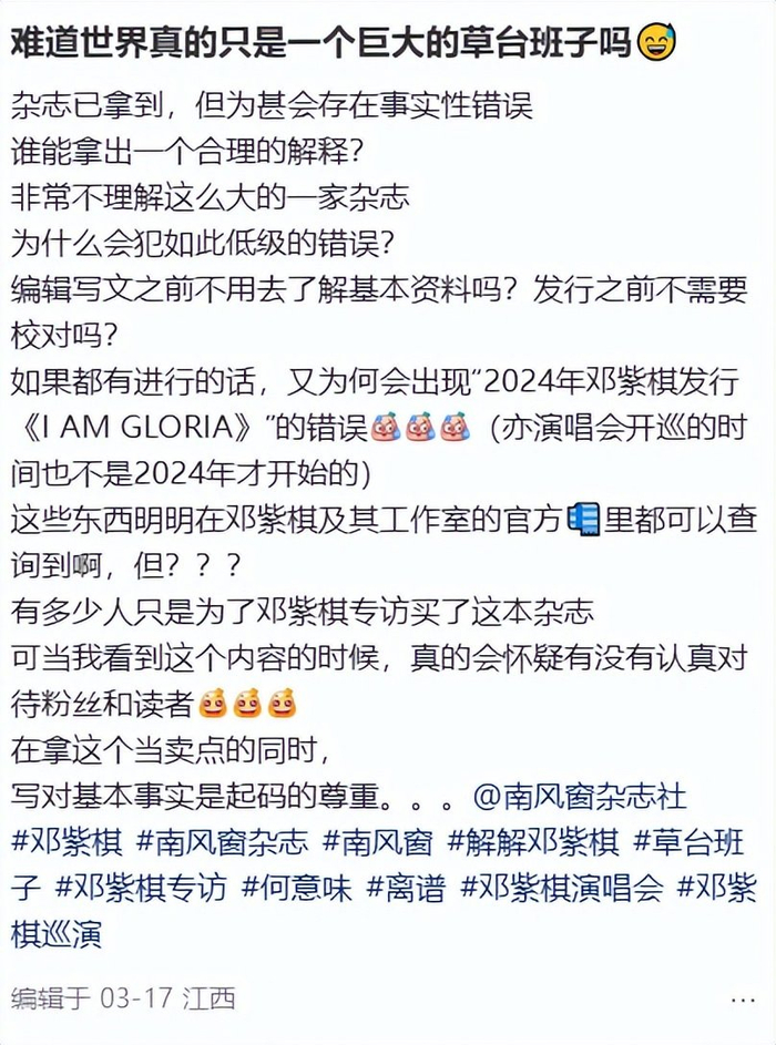 不只是恋情捉急,邓紫棋的工作团队也依然潦草,新杂志采访里出现了不少错误,还是粉丝审查出来的,也让粉丝又一次感到心寒。