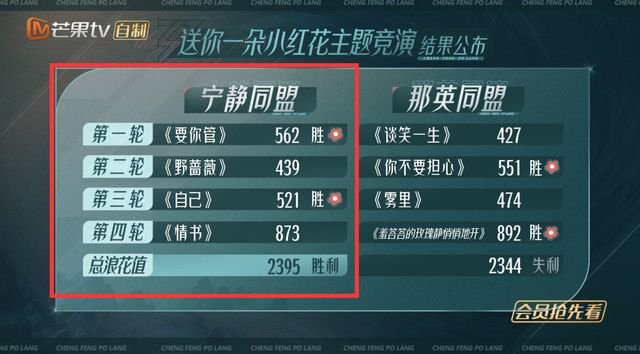 综合4轮比拼,那英和宁静大比拼打平,都是两胜两负,而根据4轮累计的总票数,宁静组获得了胜利,组内所有成员直接晋级,那英组失利,将有两人被淘汰出局。