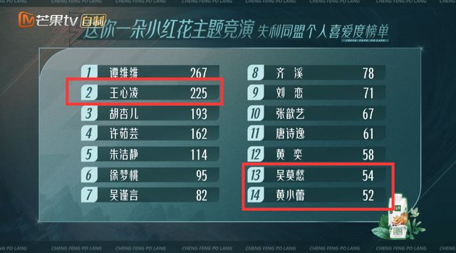综合观众喜爱度投票可以看到,实力唱将谭维维获得了267票,稳居失败组观众喜爱度第一的宝座,王心凌则以225票排名第二,第三位是192票的胡杏儿。不得不说,在“一公”录制时,王心凌还未翻红,她已经能拿到如此高的投票,可见她的观众缘确实很好。