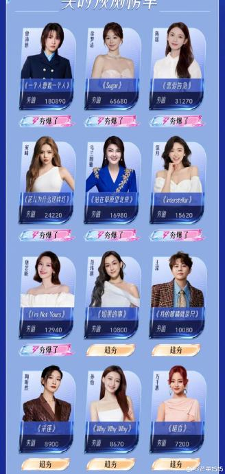 截至3月31日,曾沛慈初舞台曲目《一个人想着一个人》以 约20万票(夯值)领跑,超过第二名徐梦洁(约7.7万票)逾5倍,刷新节目初舞台纪录。