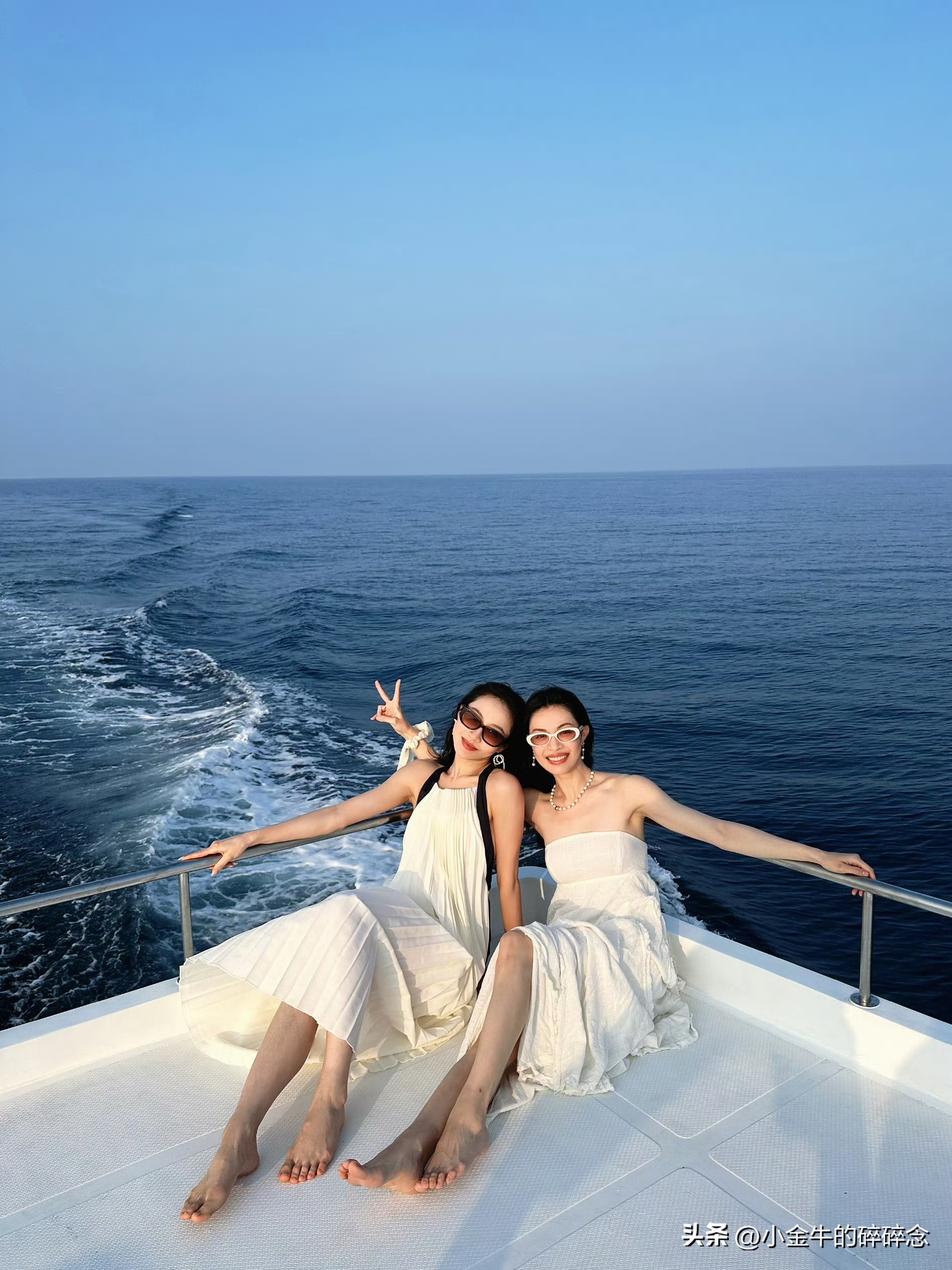 钟楚曦,晒出和闺蜜同游马尔代夫旅游照,白色抹胸裙看起来仙气飘飘,坐在船尾,秀发随风飘起的模样,真的太好看了。