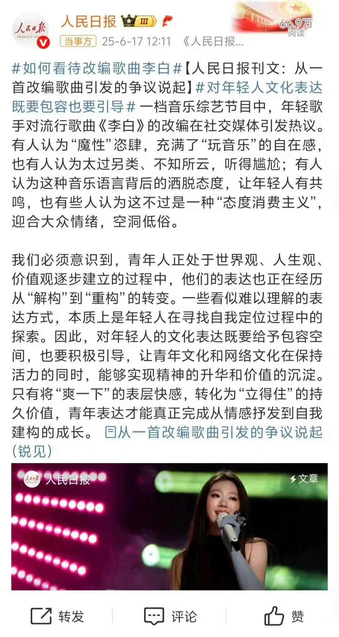 两次被官媒点名,魔改的歌词遭到官方怒批,多次触碰底线,并不是偶然事件,单依纯作为公众人物,更应该修正己身,被点名并不冤枉。