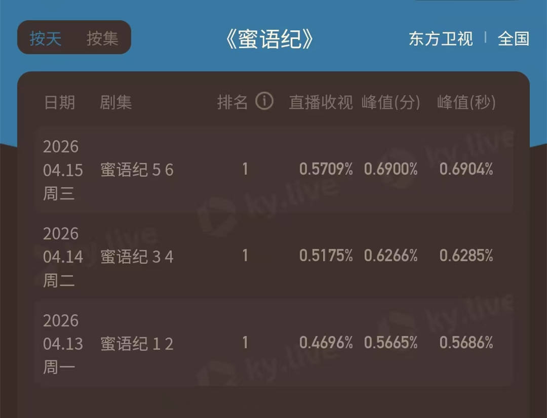 4月16日,电视剧《蜜语纪》在正版视频平台播出至第10集,在东方卫视已经连续四天上星播出。从酷云和CVB的收视率数据来看,该剧已经出现了收视率上的三连升。酷云方面的峰值收视率已经逼近0.7%,这和我预测的该剧收视率会向1%前进,已经较为吻合了。随着该剧更多剧情的上星播出,它在东方台的收视率破1%,只是时间问题了。