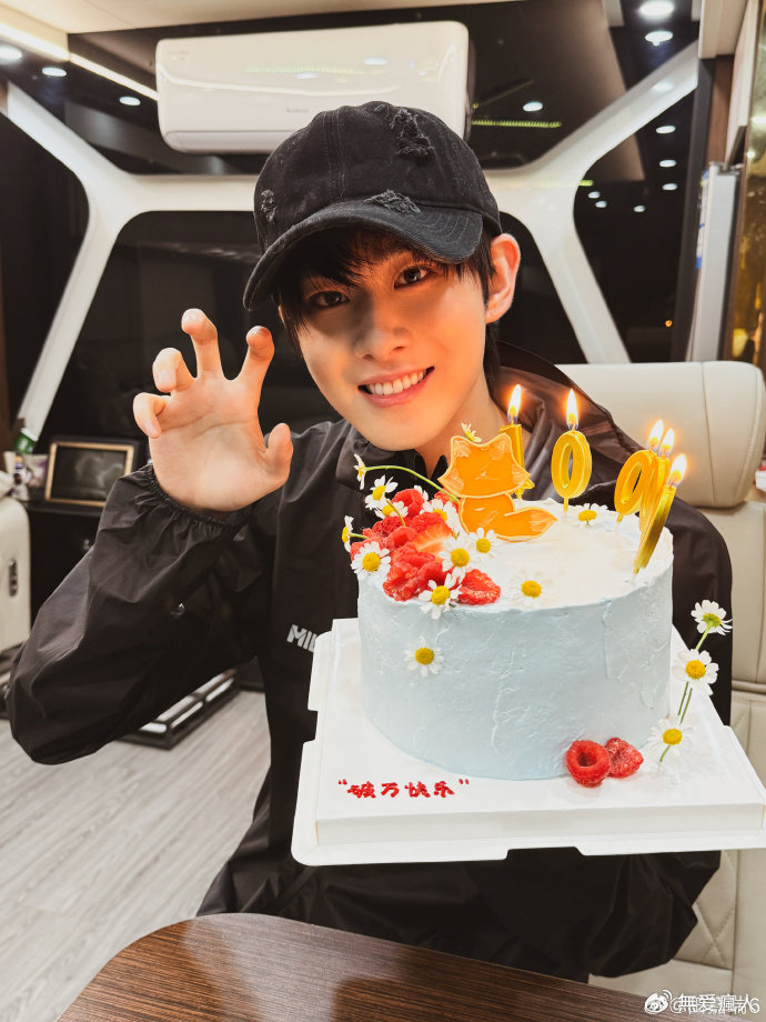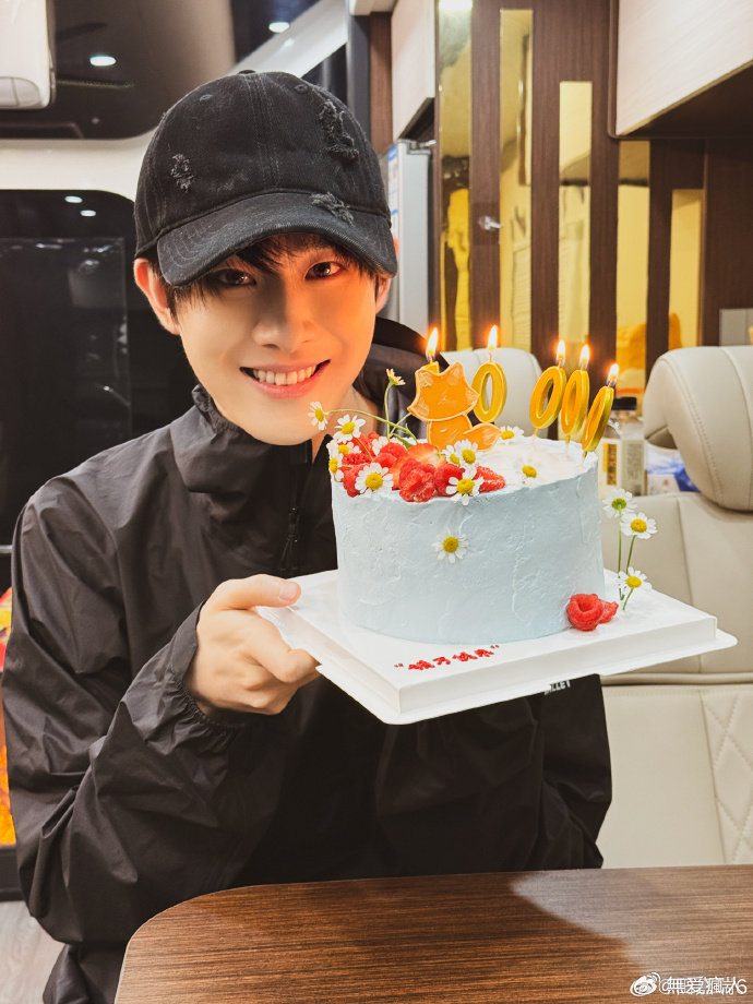 画面里,田嘉瑞头戴黑色棒球帽,身着简约黑色外套,坐在室内环境中,手中稳稳地托着生日蛋糕。那蛋糕宛如一件精致的艺术品,淡蓝色的奶油似澄澈的天空,上面点缀着洁白的小雏菊、鲜红的草莓和金黄的数字蜡烛,还有一只可爱的小狐狸装饰,处处透着清新与美好。“破万快乐”的字样,更增添了一份特别的喜悦氛围。