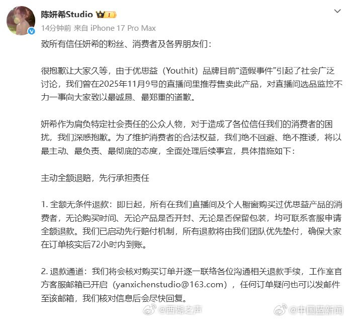 【#陈妍希回应优思益事件#】4月2日,@陈妍希Studio 发文就此前直播间推荐售卖#优思益#品牌产品致歉,承认选品监控不力,承诺对所有购买消费者全额无条件退款,72小时内到账,并终止与品牌方合作。并表示“绝不回避、绝不推诿”,接受批评监督。(中国蓝新闻) s