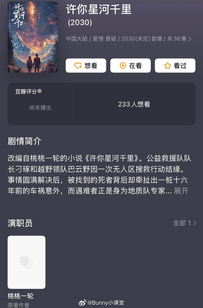 丞磊资源真好,2024一年播两部剧,2025一年播三部剧,2026播一部,喜提五连扑……接下来还有两部待播剧,现在瓜主爆料《许你星河千里》男主也是他,太厉害了