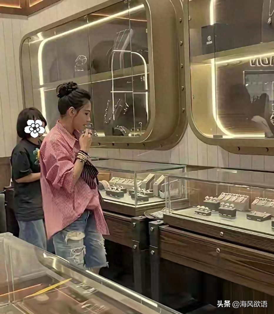 路人镜头里,她穿红白格衬衫配破洞牛仔短裤,对着几百块的小首饰反复试戴、比划长度,认真比价的模样,比任何红毯造型都让人眼前一亮。