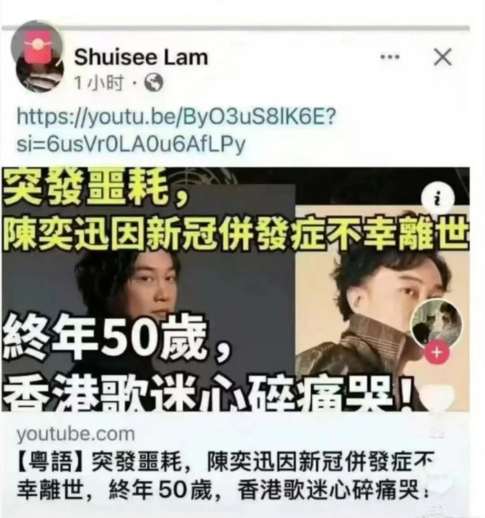 事实上,明星死讯谣言多如牛毛,陈奕迅不是第一个“受害者”,成龙、张学友、周润发、郑则仕等人都曾被造谣去世,还是希望相关平台加强管理。