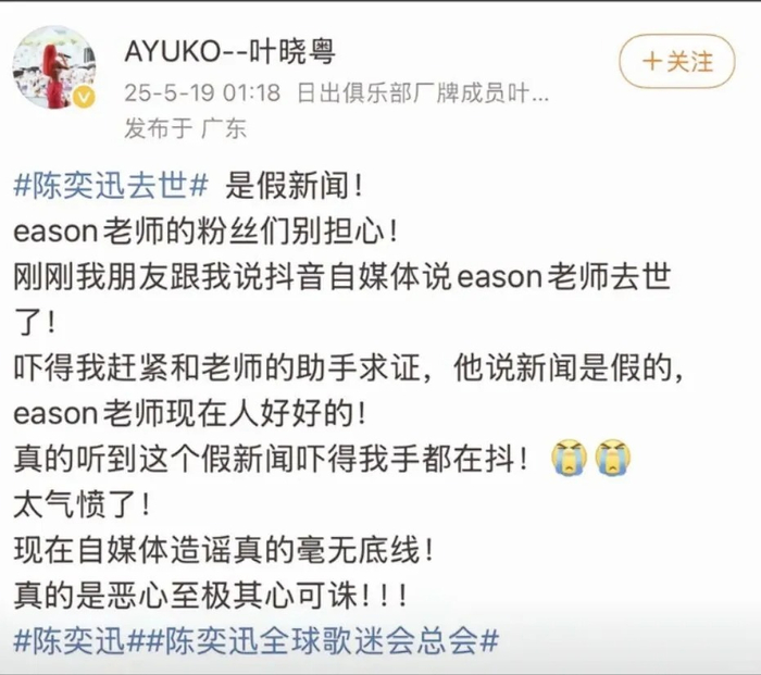 在此之前,陈奕迅的好声音学员叶晓粤发声辟谣,坦言从某平台的自媒体听说陈奕迅去世,吓了一跳,赶紧和陈奕迅助手求助,对方指出是假消息,陈奕迅老师现在人好好的。