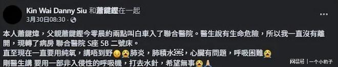 萧键铿近期因健康问题入院,他的儿子萧键炜曾透露父亲情况危急,患有肺炎、肺积水,同时伴有心脏及呼吸方面的问题,目前需要使用无创呼吸机接受治疗,希望能渡过难关:“医生说有生命危险,所以我一直没有离开。
