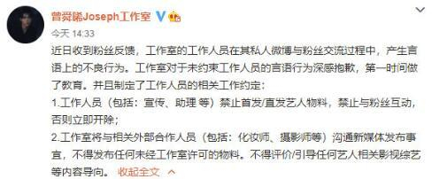 近日,有曾舜晞工作人员被指在私人账号发布曾舜晞工作图,粉丝还晒出与这位工作人员的私信记录,两方对骂言语不堪。19日下午,曾舜晞工作室发文回应,称对于未约束工作人员的言语行为深感抱歉,同时透露已在第一时间做了教育,并制定了相关要求,禁止工作人员首发/直发艺人物料,禁止与粉丝互动,否则立即开除。