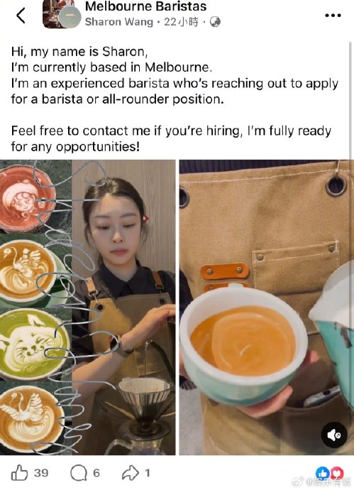 2026年4月9日,多名网友在澳大利亚墨尔本的咖啡店偶遇王承渲身着围裙、专注制作咖啡并提供服务,其工作状态被拍摄上传至社交媒体,迅速登上热搜。这并非首次相关目击,早在2026年2月已有零星信息提及她在餐饮场所兼职,此次事件则全面印证了她当前的生活轨迹。其职业转变背景清晰:2024年11月,其所属经纪公司TPG文创娱乐正式宣布暂停她的一切演艺工作。此前,她已在社交平台多次表露“想离开”的意愿,此番在澳洲咖啡店的工作,被广泛解读为其主动脱离娱乐圈、回归普通生活的具体实践。
