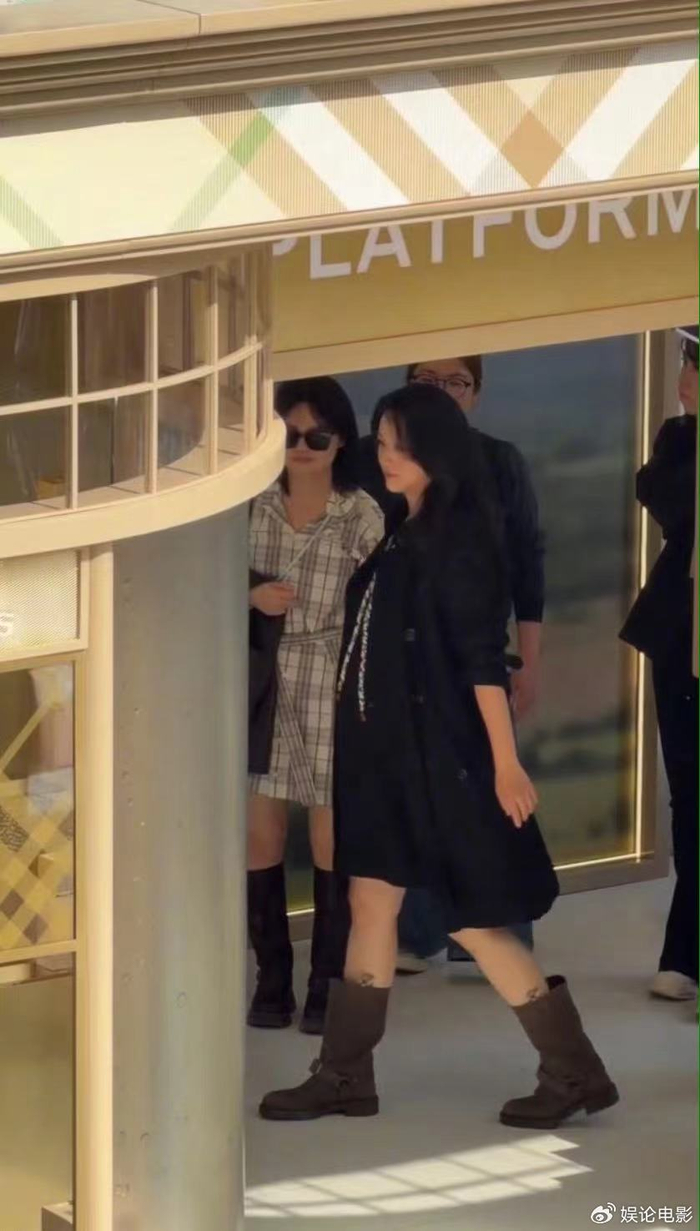 她身穿黑色长款宽松风衣,巧妙遮挡了身材曲线。
