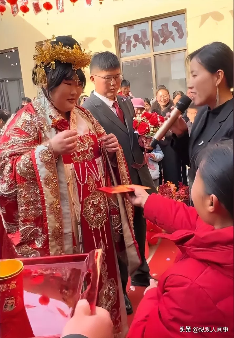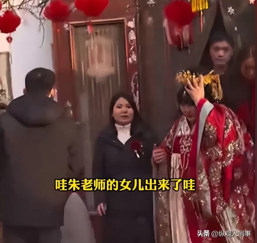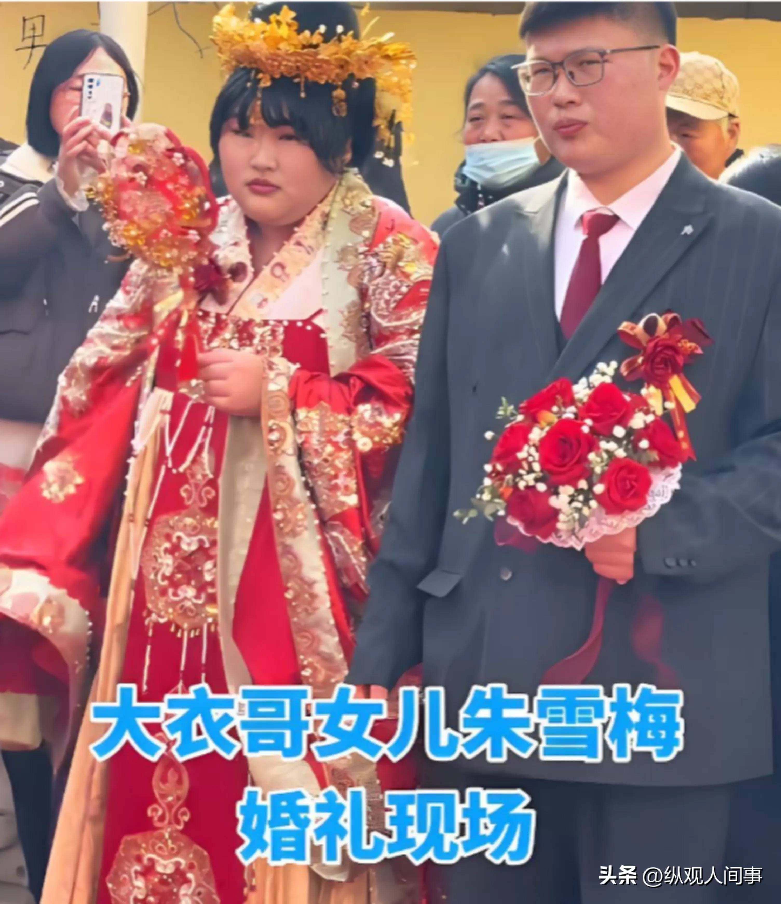 里三层外三层的人群,举着手机、支架,恨不得把镜头怼到朱雪梅和新郎的脸上拍。