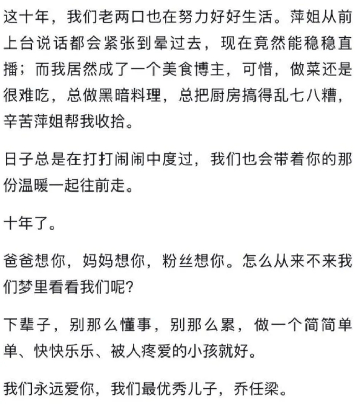 此前,清明节前夕,乔任梁父母发长文悼念儿子,全文如下: