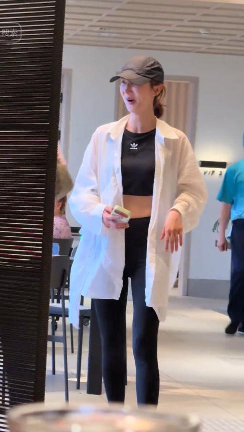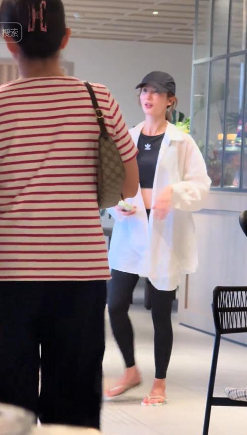 穿搭也很随意,黑色短款运动背心外搭宽松白衬衫,下身配黑色紧身瑜伽裤,脚上踩着一双人字拖。
