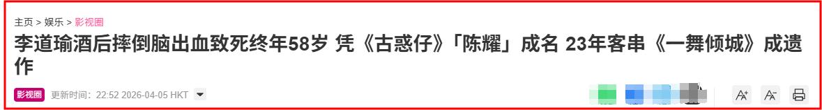 4月5日,港圈传来噩耗,港媒报道称李道瑜不幸离世,终年58岁。